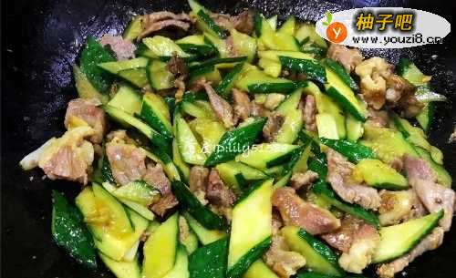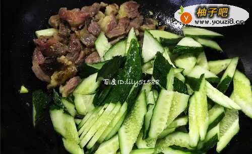 6姜和葱炒几下之后,立刻倒入黄瓜和瘦肉一起翻炒两分钟。