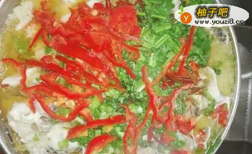 9鱼片变色后即关火,放入干椒丝、香菜、葱花等佐料。