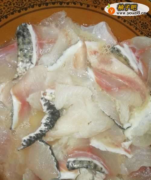4腌制鱼片。去一点淀粉、加一个鸡蛋清(蛋黄我放鱼骨头汤里了),一点料酒、醋,将生鱼片腌制。
