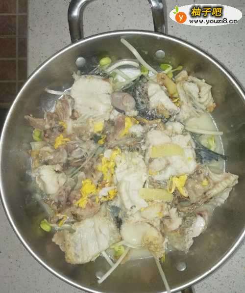 3将鱼片放在一边,大锅烧热油锅,煎炸鱼骨头10分钟。放入一点盐,加入1200克的开水,煮一个小时。当然也得加些姜、蒜。