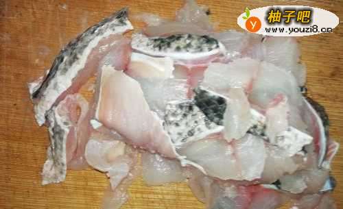 2黑鱼的处理。用刀削去黑鱼的鱼身,留下骨架和鱼头剁碎。酸菜鱼鱼片味嫩,但香味主要来自长时间炖的鱼骨。