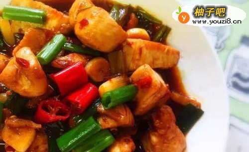 4加入调味料调味,放入煎好的鸡肉入锅拌炒至汤汁有点收干,最后下葱绿拌炒一下