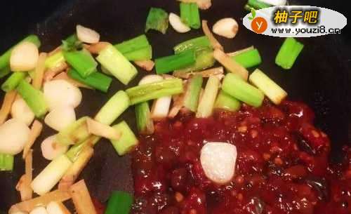3爆香葱白、蒜末及姜末,喜辣者可以先把辣椒放入一起爆香,再加入辣豆瓣酱炒香