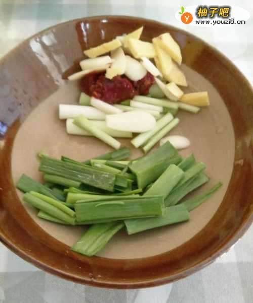 2准备配菜:蒜片、姜片、豆瓣、蒜苗。