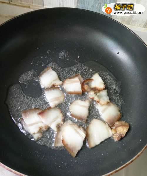 4锅里放少量油,腊肉炒出油,加入配菜和白糖。