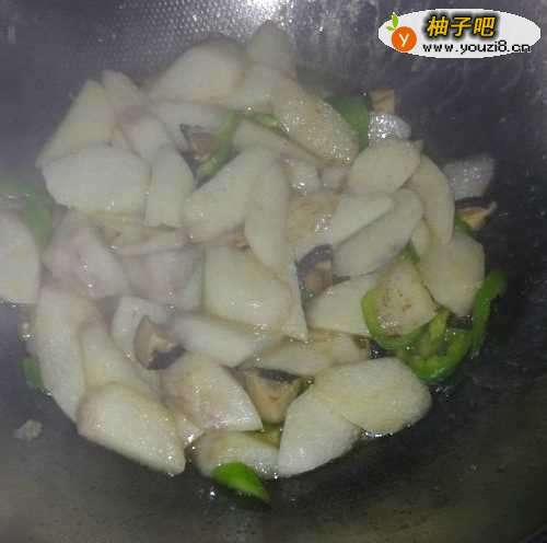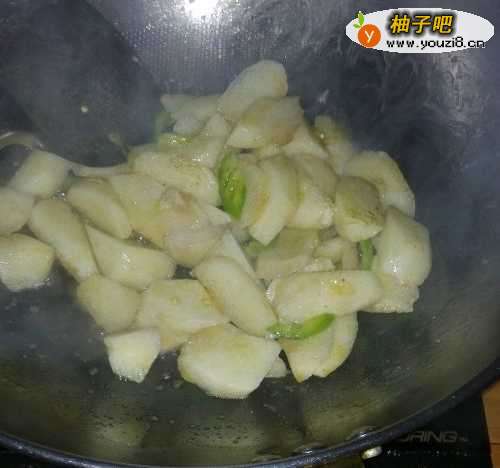 2锅底油适量,烧热后倒入青椒和山药,翻炒后,倒适量料酒。