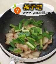 4翻炒至五花肉变色,加入青蒜