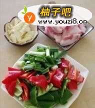 五花肉洗净、切片,青红椒切块,青葱泥财切段,蒜切片,姜切末