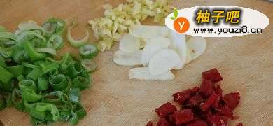 3干辣椒去籽切小段,蒜切片,葱姜切小粒备用。