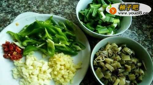 5将准备好的青椒等配料同样切成小片或者小段备用。