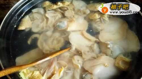3将蚌肉进行淖水,起锅,放入适量清水,烧开水放进两勺二锅头,姜片,在将洗干净的河蚌肉下锅用锅铲翻动下差不多十秒左右就可以捞出来!