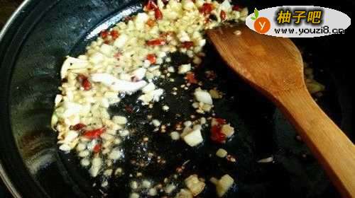 6起锅,倒入食用油烧热,放入姜蒜干辣椒段等爆香!