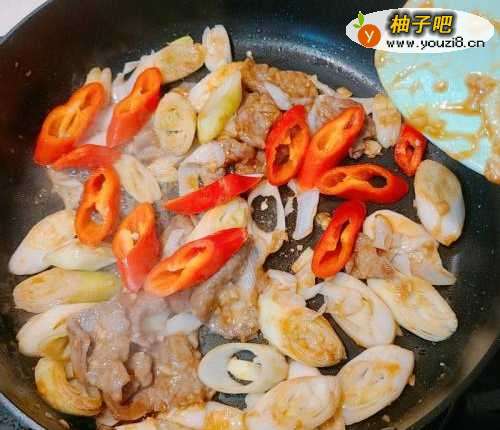5最后加入红椒片翻炒即可。