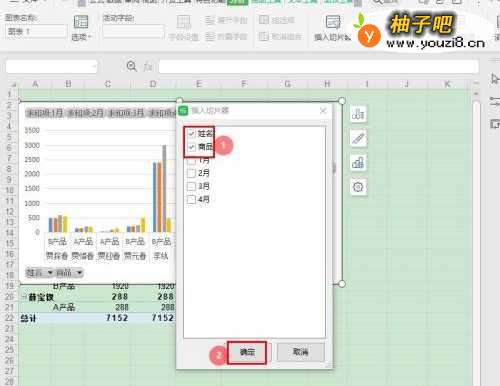 5在“插入切片器”对话框中,勾选【姓名】、【商品】,点击【确定】;