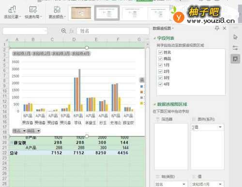 3在“数据透视图空格”中,将【姓名、商品】拖至【轴(类别)】,1-4月数据拖进【值字段】;