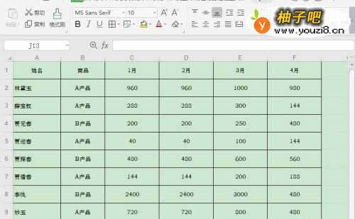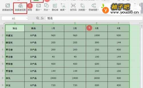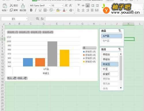 6点击切片器上的姓名、商品,图表就会展示相应的数据了。