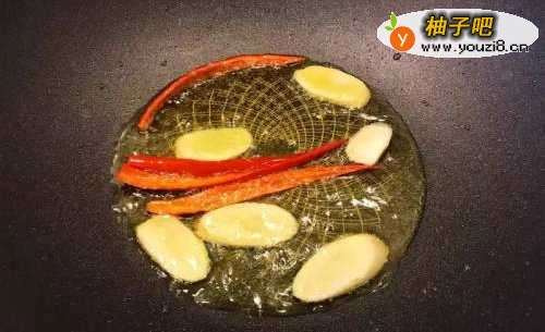 2起热锅先下油,再下姜片跟辣椒丝中小火炒至姜片开始变干状