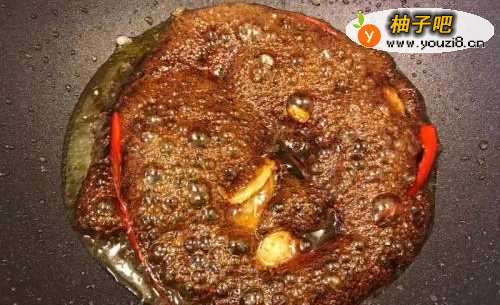5上色后放入八角跟1茶匙盐炒匀,酱汁滚开转中小火炒