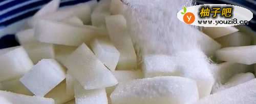 2处理洗净的白萝卜去皮,切成厚片后再切成粗条,切好后放进盆内加适量盐,比平时的量多一些就可以,再加一勺白糖,用手抓拌均匀腌制60分钟。