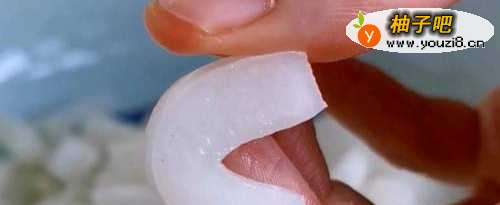 4腌制好的白萝卜放进纱布中用力攥干水分,腌制好的萝卜像这样折不断,吃起来才会更清脆。