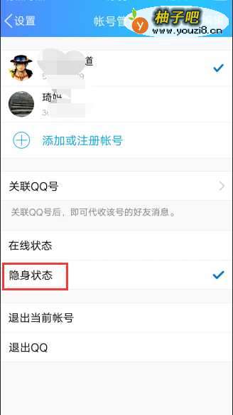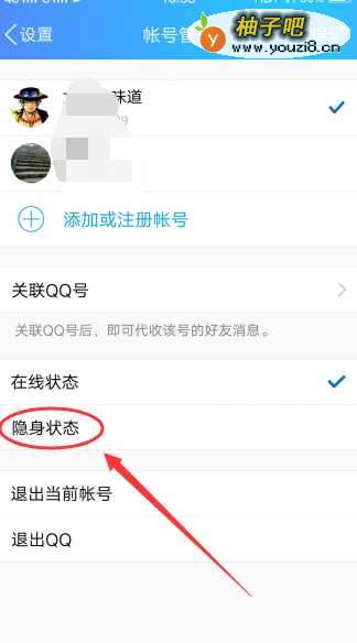 4接下来,在账号管理页面下,有关于QQ在线状态的设置,分别是在线和隐身欠舍两个,点击隐身。泛宙码