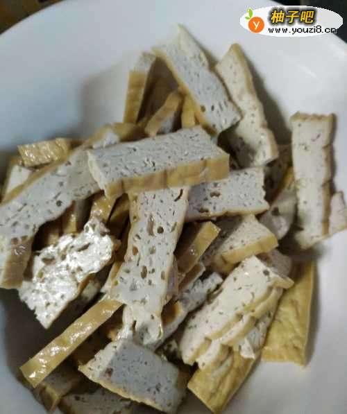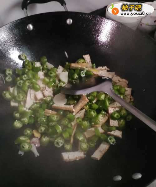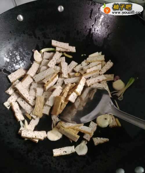 5第五步,向锅里倒入切好豆干,加入适量的水翻炒。