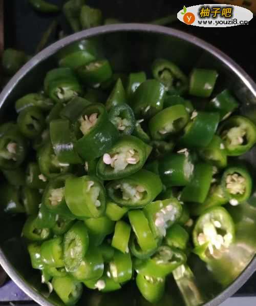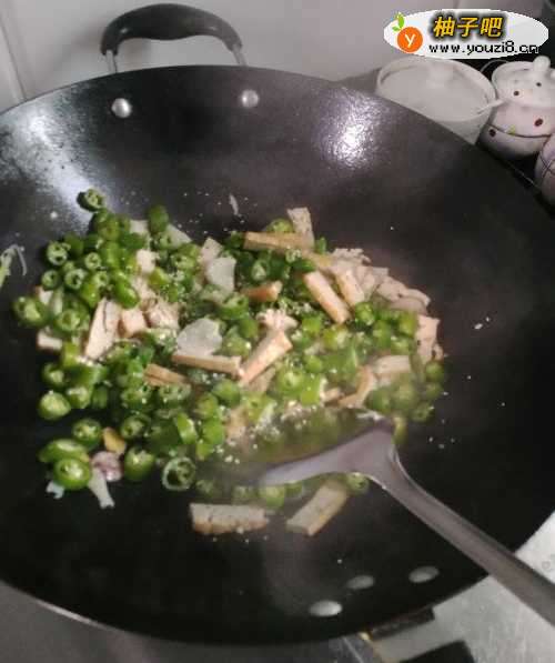 6第六步,然后在锅里倒入青椒继续翻炒。