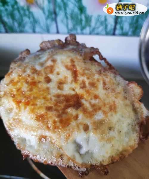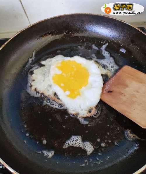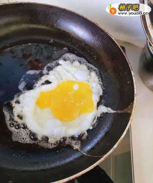 7下面的图片是煎好的荷包蛋。由于蛋黄破裂所以只能煎成这样子。如果鸡蛋没有破裂,可以单面煎,效果更漂亮。