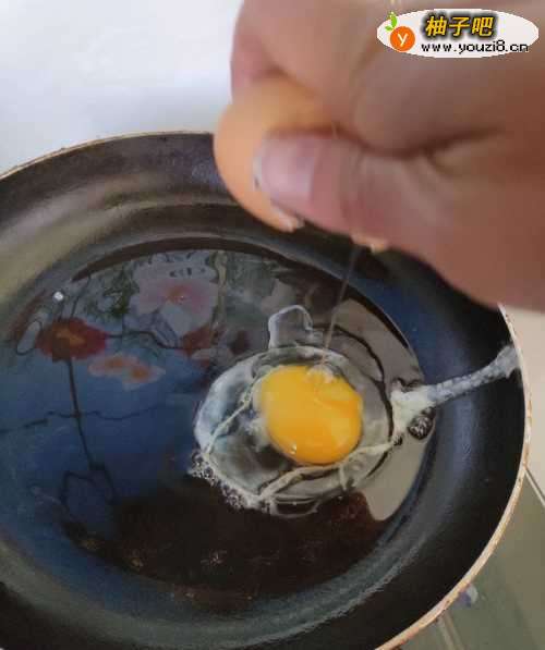 3油刚冒油烟的时候,打入鸡蛋。我这里的鸡蛋没选好,蛋黄破裂了,煎出来卖相肯定不好。