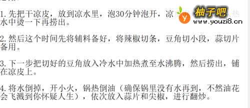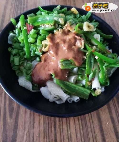 5翻炒几下后加入一小勺郫县豆瓣酱,然后出锅,倒在凉皮上,最后将火锅蘸料倒入搅拌均匀即可。