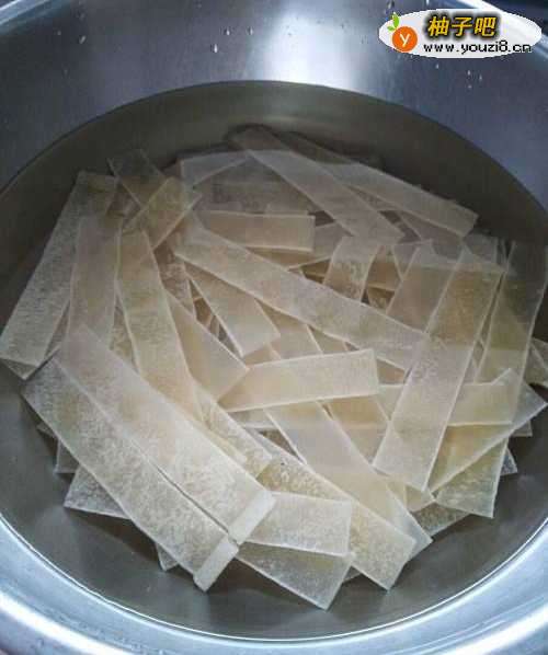 先把干凉皮,放到凉水里,泡30分钟泡开,凉皮泡好后,放入热水中烫一下再捞出。