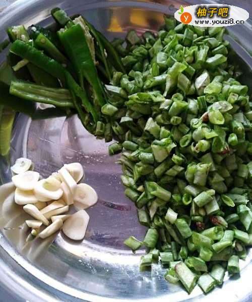 2然后这个时间先将辅料备好,将辣椒切条,豆角切小段,蒜切片备用。