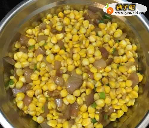 4然后放入玉米,大火炒至5分熟。