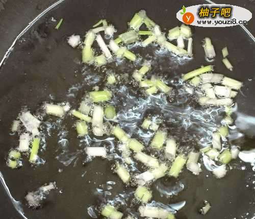 3炒锅热油,先将葱白爆香。