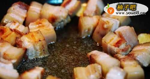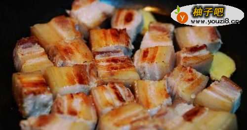 6把五花肉码放在平底锅里,中小火把肉块每一面都煎至金黄色