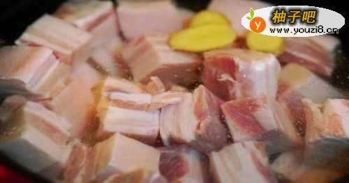 3锅内放入水,五花肉冷水下锅,再放入2片姜片