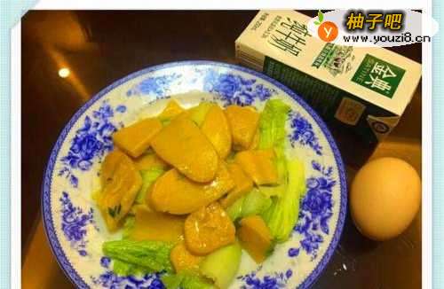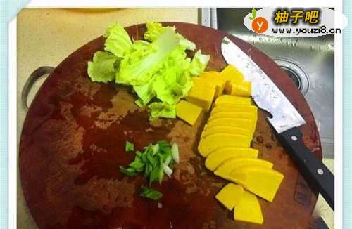 2黄元米果冲洗切片,娃娃菜心、青蒜切好备用
