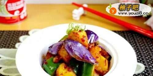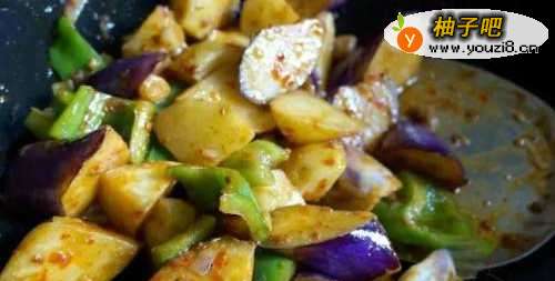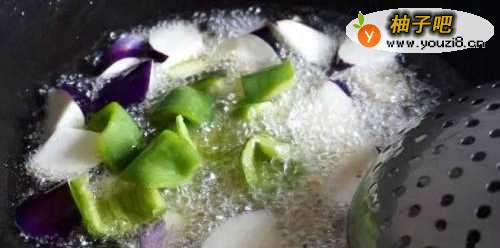 3再放入茄子、青椒烧几秒钟捞出