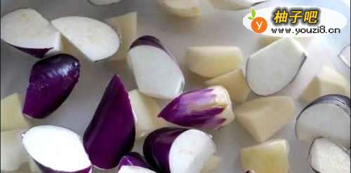 食材切成块状后,将马铃薯与茄子泡入盐水中(只要1小匙盐)