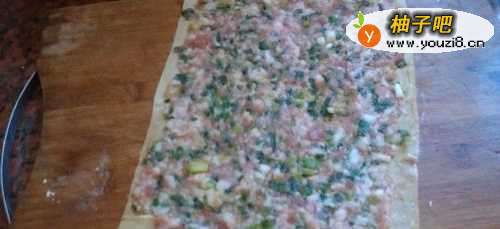 5洗湿后,铺上肉馅,可尽量抹平些。