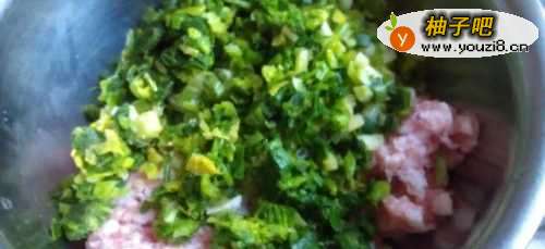 2把肉馅放入盆中,放入小葱花,加入香芹叶。