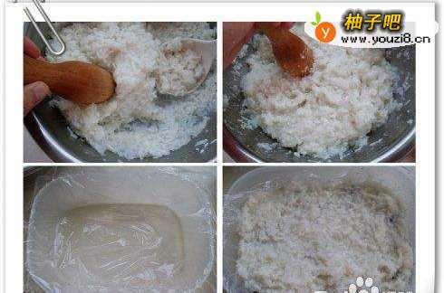 7把蒸好的糯米用勺子或捣蒜的碾压筋道。