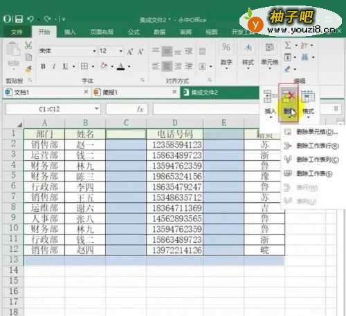 4然后点击菜单栏中的【开始】,点击【单元格】,选择【删除】按钮,然后点击【删除单元格】,如图所示:
