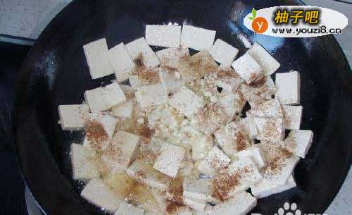 6将姜、蒜末和十三香,少量盐撒在豆腐上