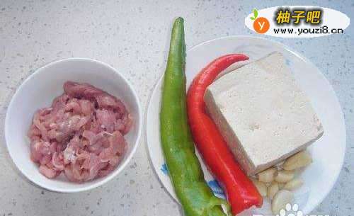 豆腐一块、猪瘦肉、红椒1根、青椒1根