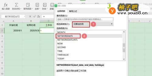 4在“插入函数”窗口,选择类别【日期与时间】—【NETWORKDAYS函数】,点击【确定】;