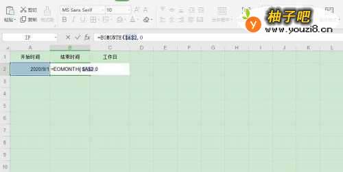 2选择单元格【B2】,输入公式 【=EOMONTH($A$2,0)】,自动计算出月末日期;