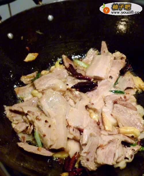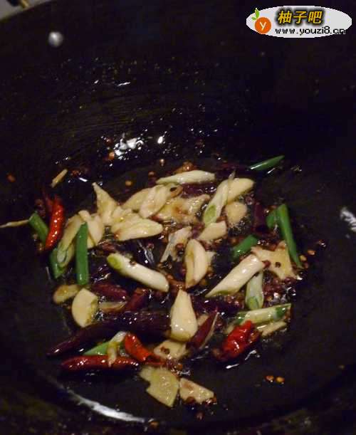 5炒锅上火,加很少的油煸香辣椒、花椒及葱姜蒜。
