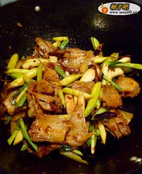 9下入青蒜,点少许料酒,糖调好味道即可出锅。