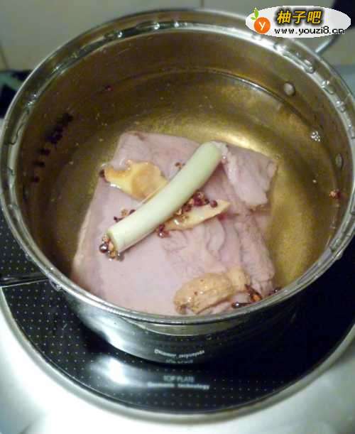 带皮五花肉冷水下锅加入葱段、姜片花椒7、8粒,黄酒适量煮开。